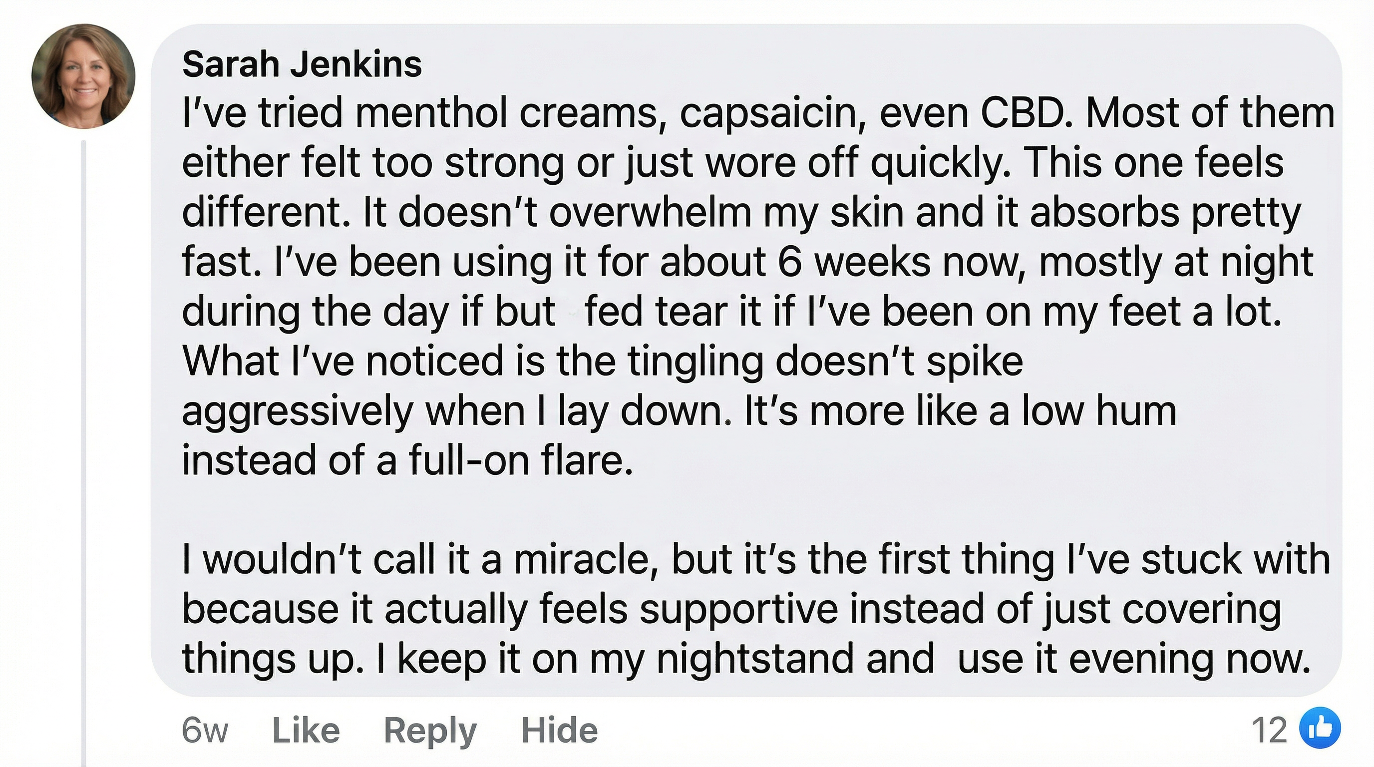 Instead of masking the signal, this topical formula supports healthy microcirculation, a calmer nerve environment, reduced nighttime hypersensitivity.